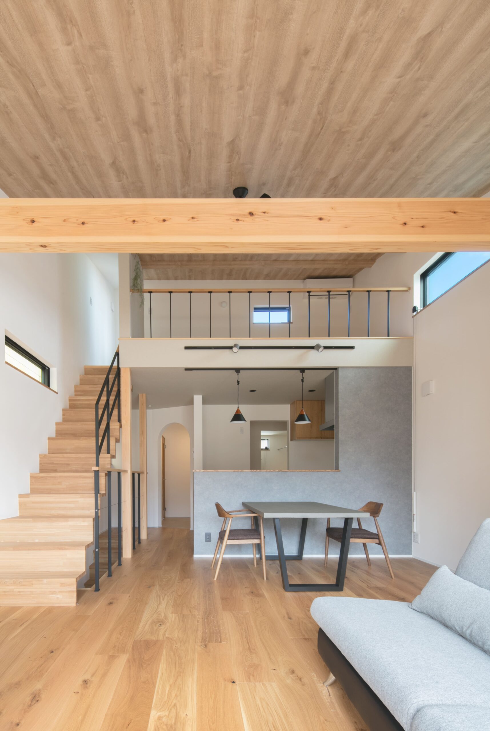 木の温もりを感じる、開放感あふれるリビング・ダイニング。 天井と床にふんだんに使われた木材が空間を優しく包み込みます。 ハイサイドライトから光が降り注ぎ、スケルトン階段が空間のアクセントに。 昼と夜で異なる表情を見せる、居心地の良い空間です。